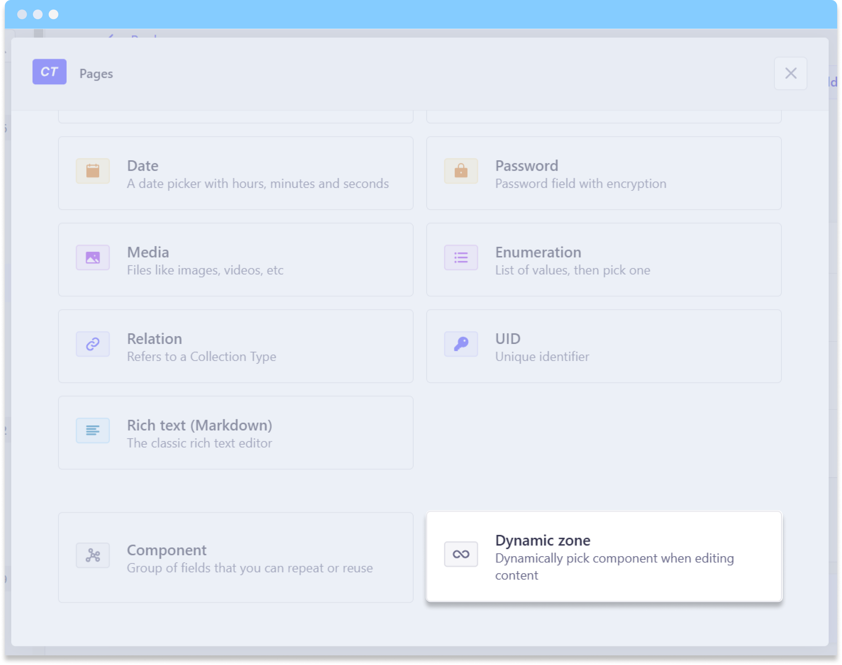 Динамическая зона — это тоже тип данных поля. Когда разработчик создает поле с типом данных Dynamic zone, он должен выбрать компоненты, которые будут доступны в рамках динамической зоны. Контент-менеджер при создании экземпляра сущности, имеющей поле типа Dynamic zone, может выбирать в рамках этой зоны любые доступные в ней компоненты в любом порядке и количестве и задавать свои значения полям этих компонентов.